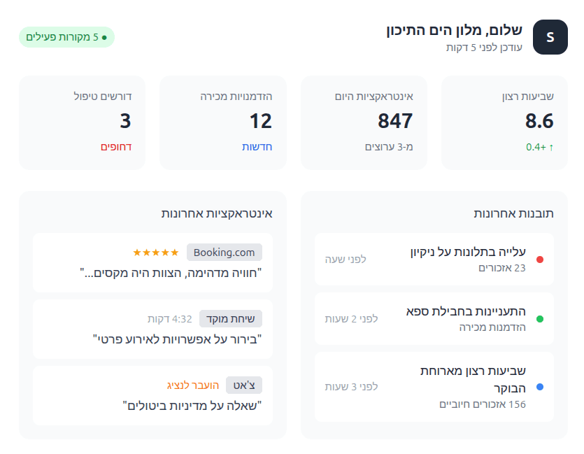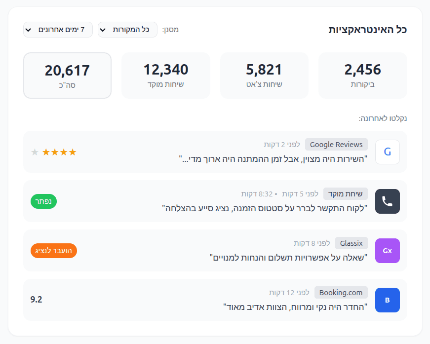אנחנו מתחברים לפלטפורמות ביקורות מובילות כמו Google Reviews, Booking.com, Airbnb, TripAdvisor, Expedia ו-Duve, למערכות צ'אט כמו Glassix, ולמוקדי שירות טלפוניים