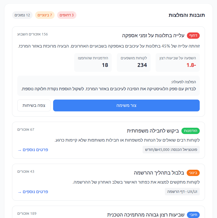 זיהוי בעיות חוזרות, הזדמנויות מכירה שהוחמצו ותיעדוף לפי חשיבות. כל תובנה הופכת למשימה